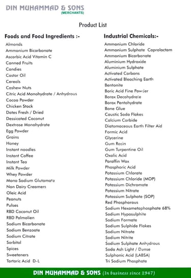 Din Muhammad & Sons (Since:1947) are well-established Commercial Importers and Exporters of Chemicals and Industrial Raw Materials in Pakistan.
