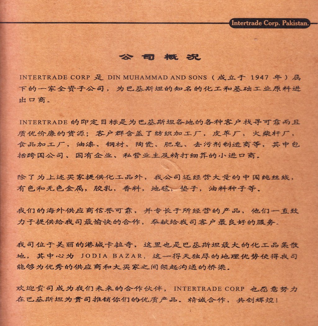 Intertrade Corporation (Indent Agents Est. 1997) is a wholly-owned subsidiary of Din Muhammad and Sons (Since 1947) a well-established Commercial Importers and Exporters of Chemicals and Industrial Raw Materials in Pakistan.